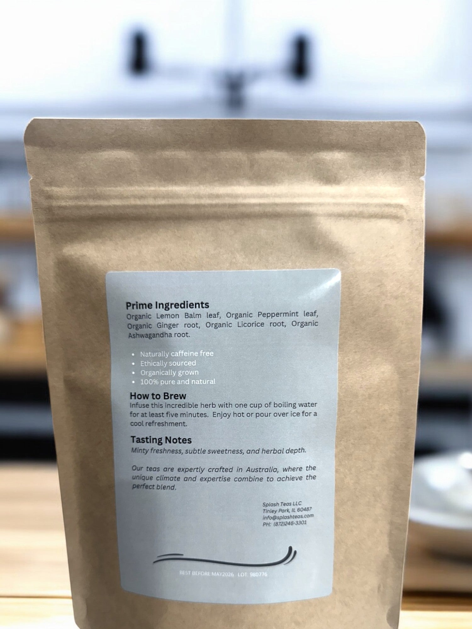 Organic lemon balm leaf, organic peppermint leaf, organic ginger root, organic licorice root, organic ashwagandha root.