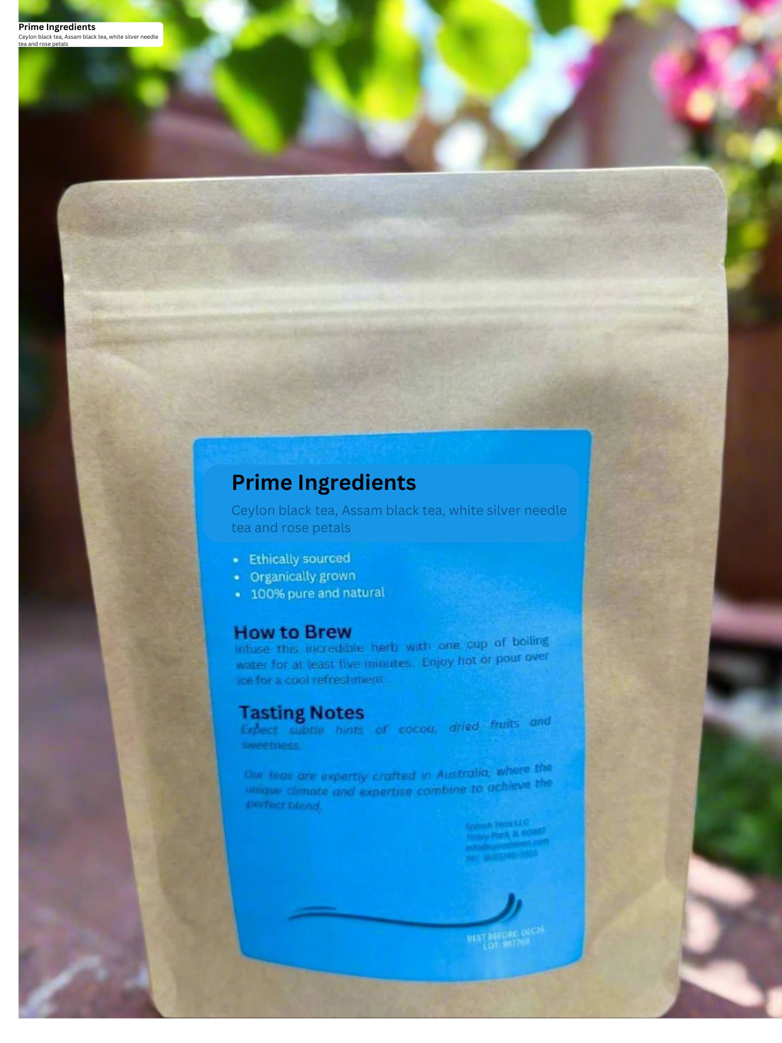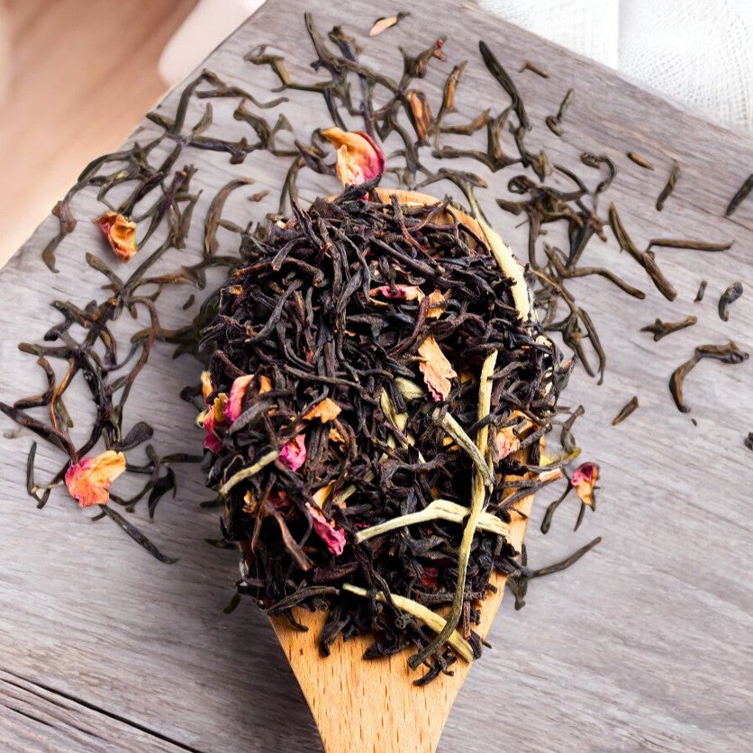 Ceylon black tea, Assam black tea, white silver needle tea and rose petals.