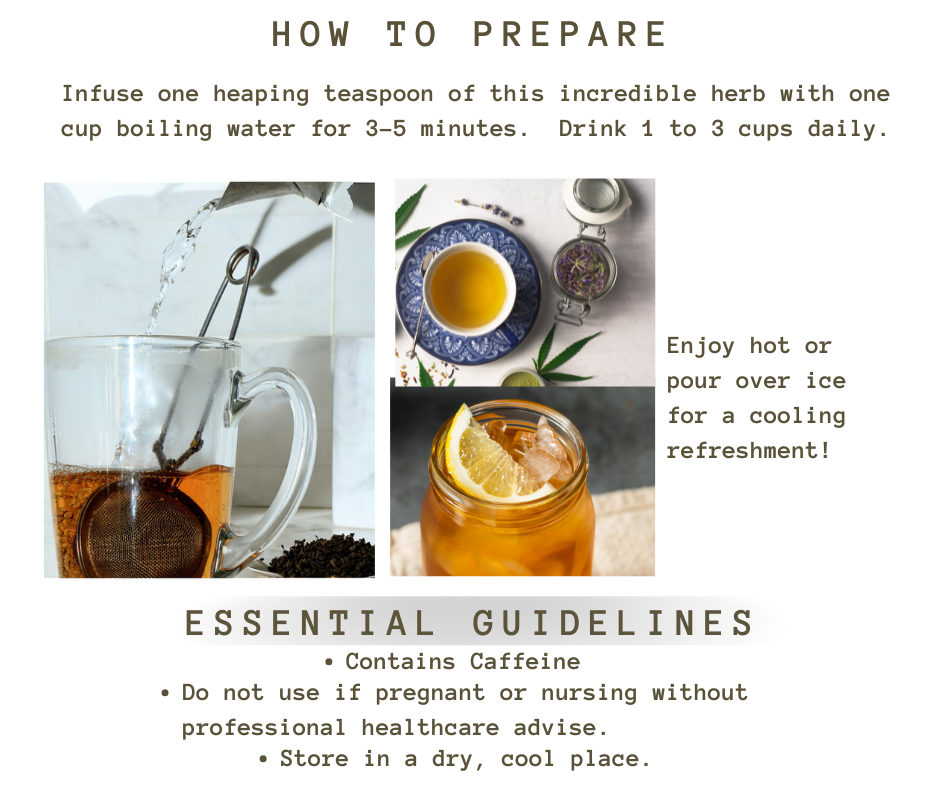 - Infuse one heaping teaspoon of this incredible herb in one cup of boiling water for 3-5 minutes. As a rule of thumb, consider increasing the steeping time slightly when re-steeping to extract more flavor. Always taste to find the perfect steeping duration for your preferences!