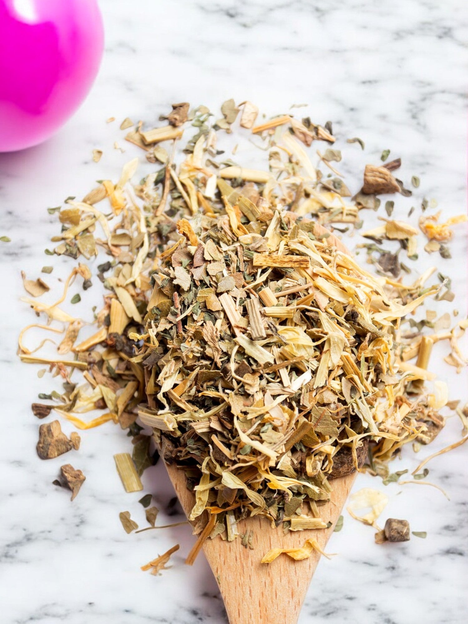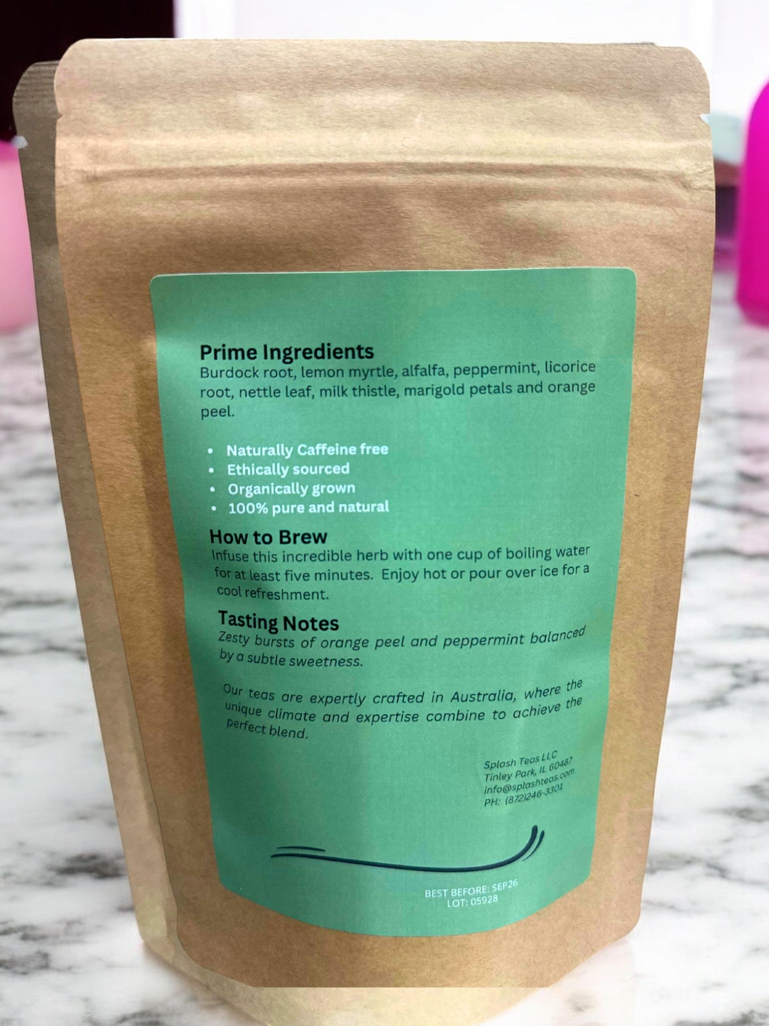 Burdock root, lemon myrtle, alfalfa, peppermint, licorice root, nettle leaf, milk thistle, marigold petals and orange peel.