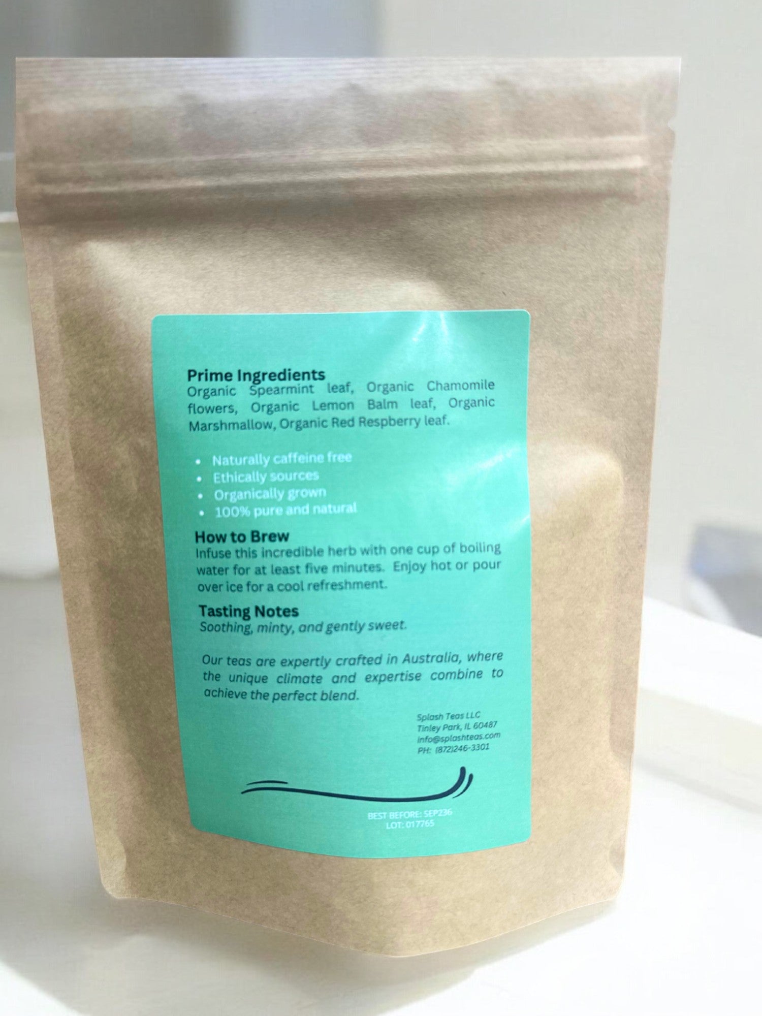 Organic Spearmint leaf, Organic Chamomile flowers, Organic Lemon Balm leaf, Organic Marshmallow, Organic Red Raspberry leaf.